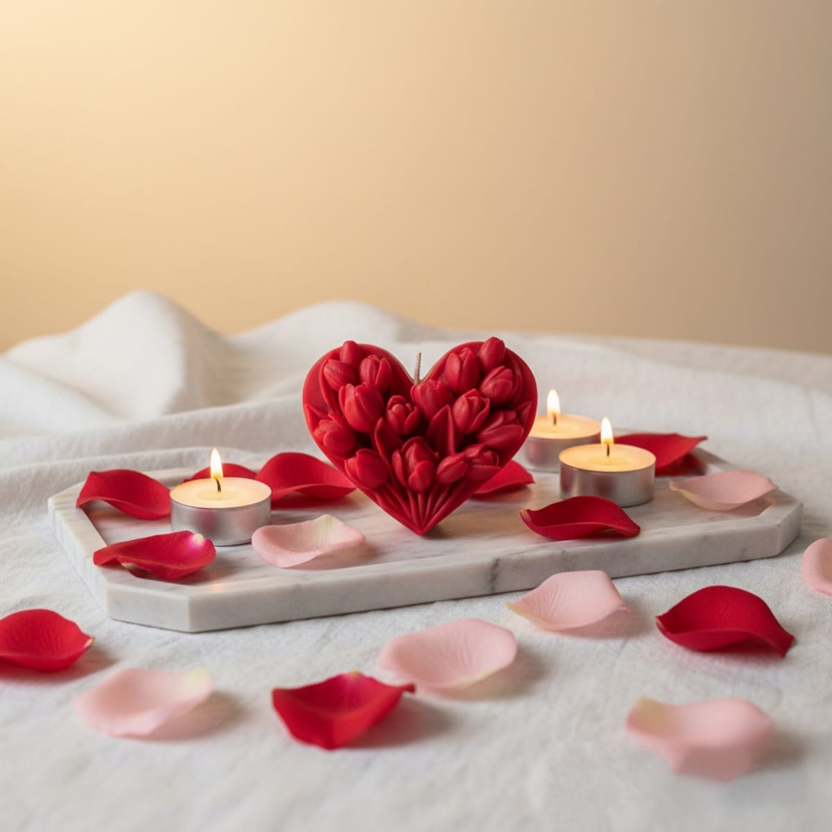 Тази зашеметяваща 3D свещ е изваяна под формата на сърце, прецизно изградено от десетки съвършени цветни пъпки.