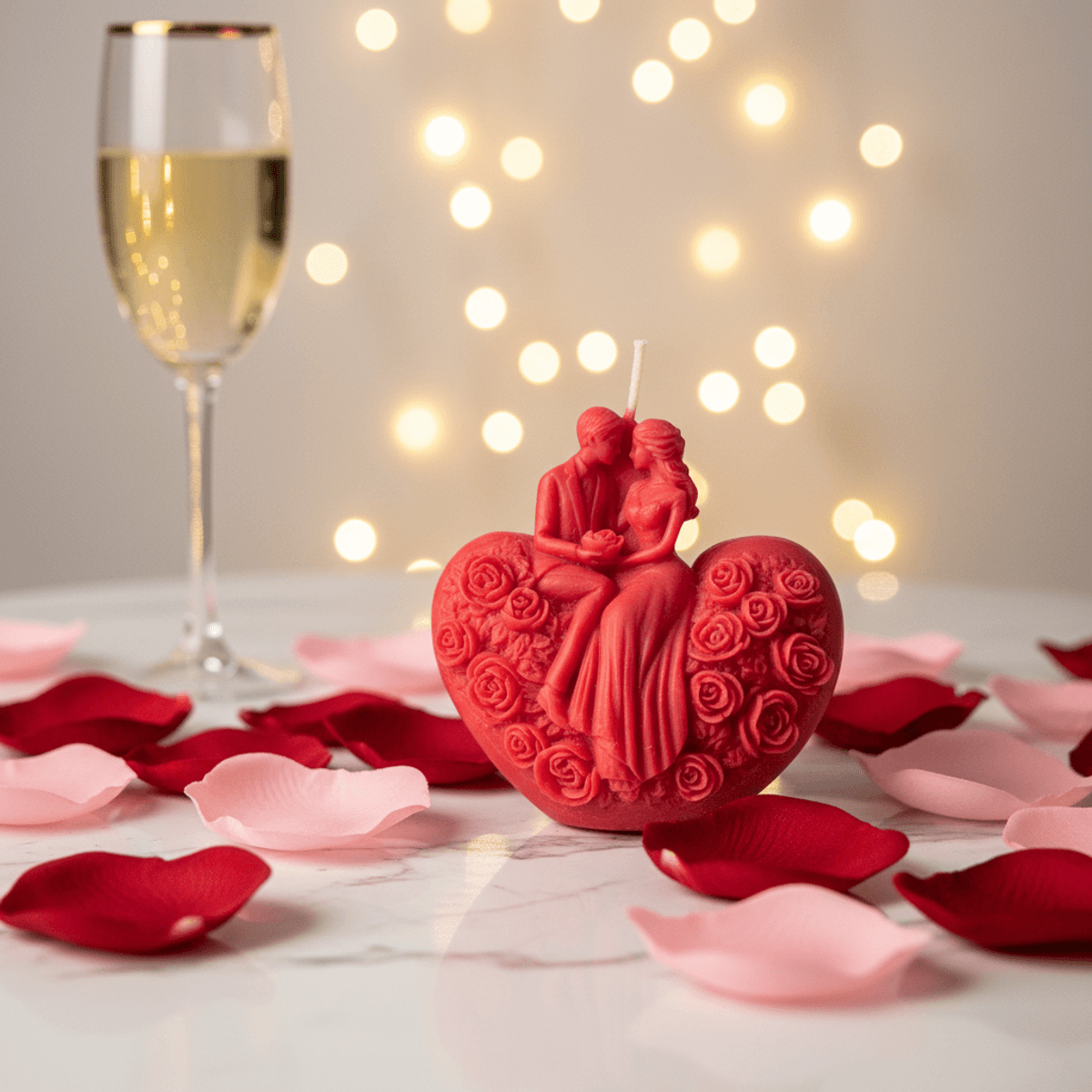 🪔Внеси топлина и романтика в дома си с тази изящна ръчно изработена свещ. Дизайнът с влюбена двойка върху сърце от рози е перфектният символ на близостта, съчетан с ухание, което прегръща сетивата.