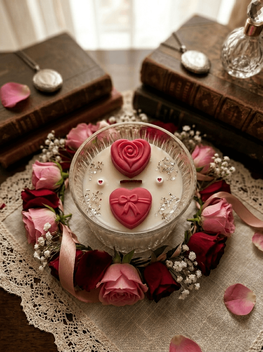 Бутикова свещ "Vintage Romance" | Ръчна изработка с дървен фитил и 3D сърца